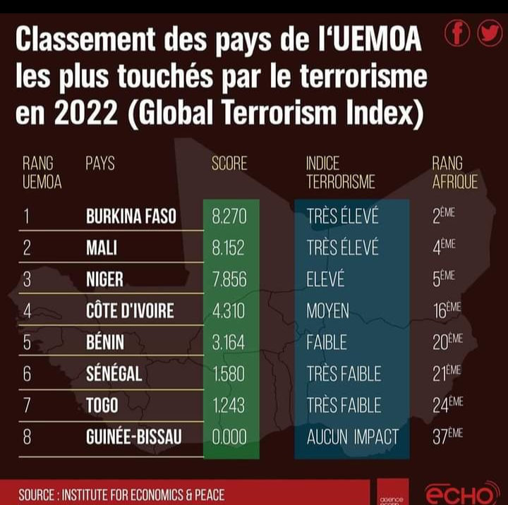 L’Institut d’Economie et de la Paix (EIP) a publié le rapport 2022 de l’indice mondial du terrorisme. Dans ce rapport se figure le classement des pays membres de l’UEMOA.